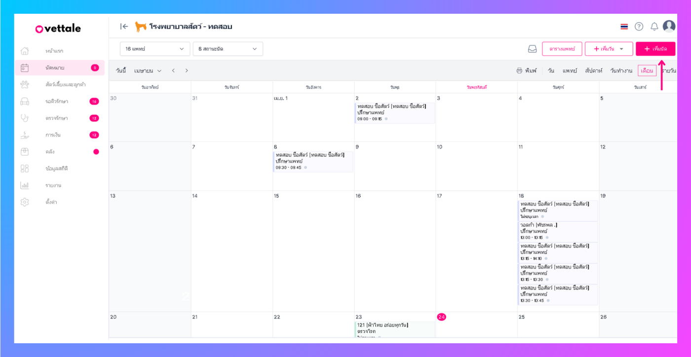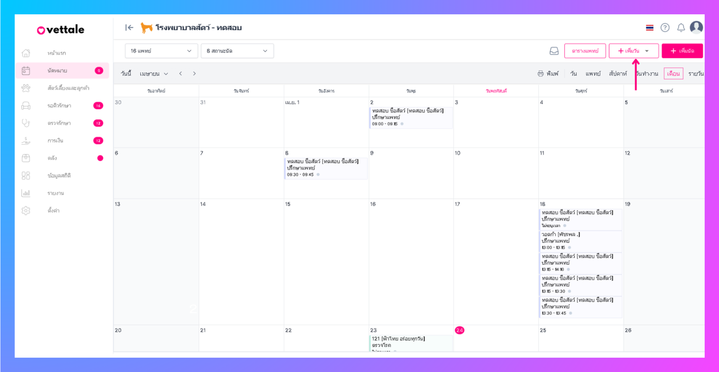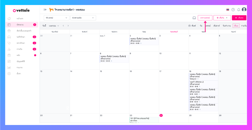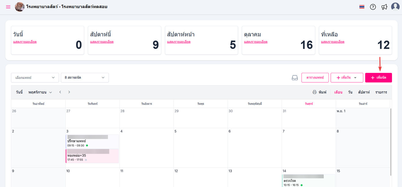 ผู้ใช้งานสามารถเพิ่มกำหนดการนัดหมายเพื่อจองนัดหมายล่วงหน้าโดยการ คลิกที่เพิ่มนัด