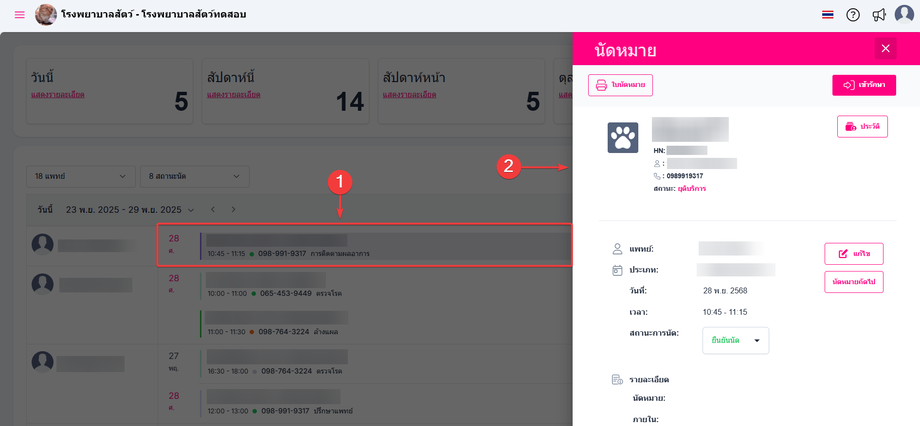 เมื่อคลิกที่รายการนัดหมาย ระบบจะแสดงหน้าต่างข้อมูลรายละเอียดนัดหมาย