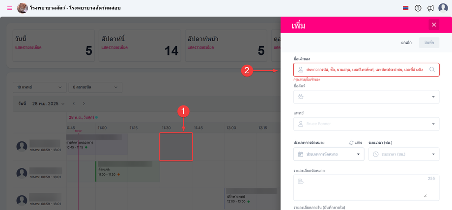 กดที่ช่องว่างที่ไม่มีการนัดหมายในช่วงเวลานั้นๆยกตัวอย่างตามหมายเลข 1 ระบบจะแสดงการเพิ่มกรอกนัดหมายแพทย์ใหม่ของวันนี้ตามตัวอย่างหมายเลข 2