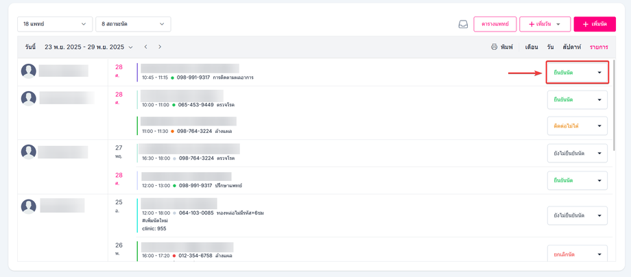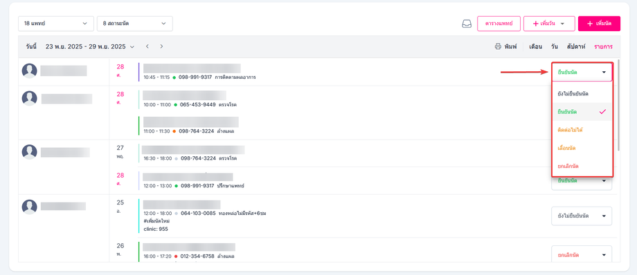 เลือกสถานะที่ต้องการ ยังไม่ได้ยืนยันนัด ยืนยันนัด ติดต่อไม่ได้ เลื่อนนัด ยกเลิกนัด ที่ตารางนัดหมายนั้นๆ