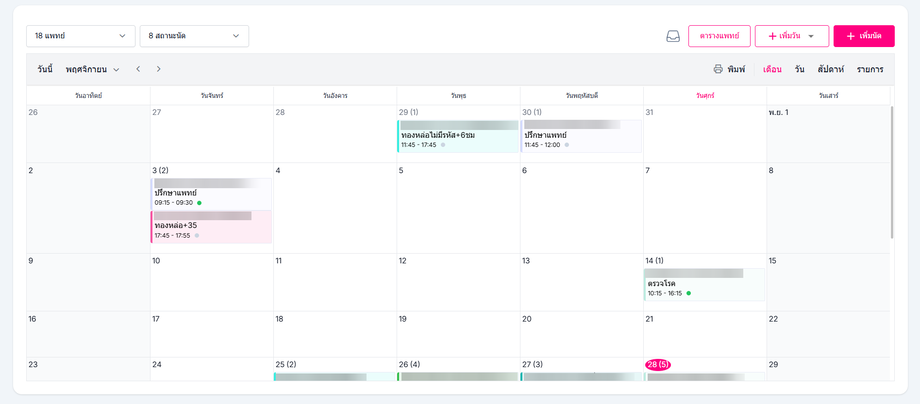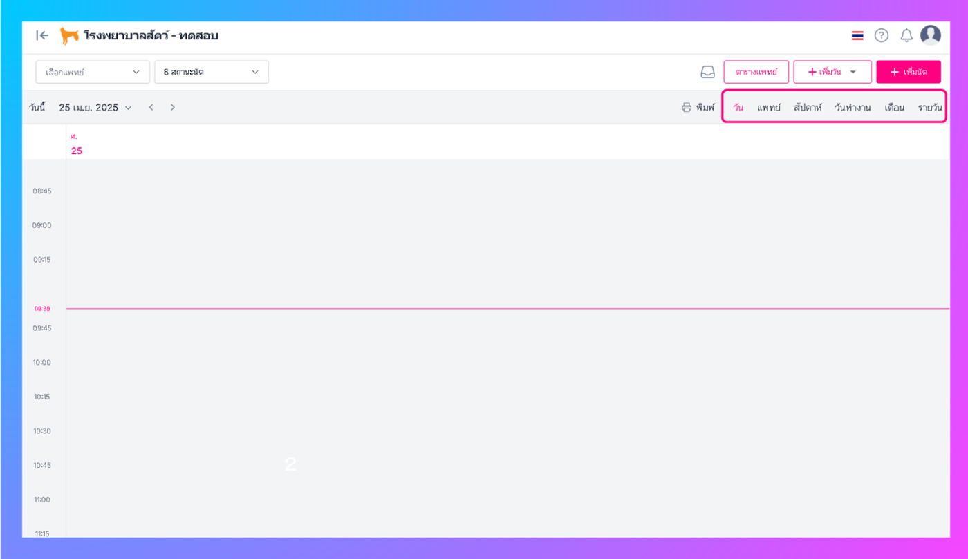 ผู้ใช้งานสามารถเลือกรูปแบบที่จะแสดงสถานะนัดหมายได้โดยการเลือก วัน แพทย์สัปดาห์ วันทำงาน เดือน รายวัน