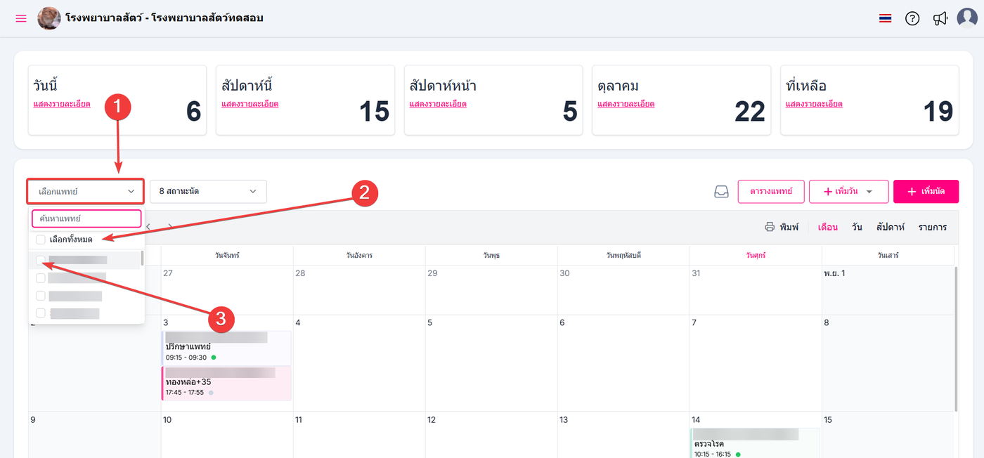 สามารถเลือกแสดงรายการนัดหมายของแพทย รายคนได้ที่หมายเลข 3