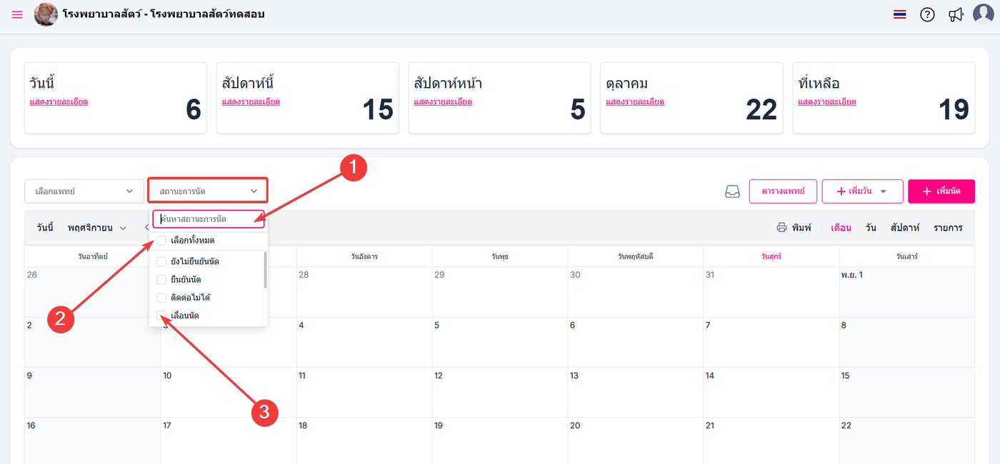 เลือกสถานะของการนัดหมายที่ต้องการค้นเป็นรายการ ตัวอย่างหมายเลข 3