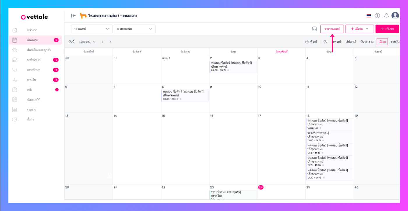ระบบจะเข้าสู้หน้าตาราง ตารางจะแสดงรายชื่อที่แพทย์เข้ามาทำงานให้แต่ละวัน สามารถเลือกดูเฉพาะแพทย์ได้โดยคลิกที่แพทย์จากนั้นเลือกชื่อแพทย์ที่ต้องการ