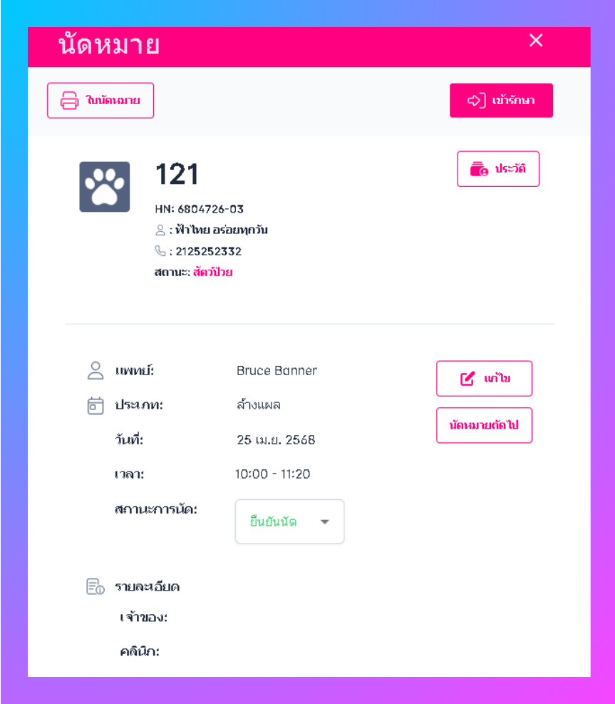 ผู้ใช้งานสามารถคลิกที่ แก้ไข เพื่อแก้ไขข้อมูลหรือ ยกเลิกนัดหมายได้