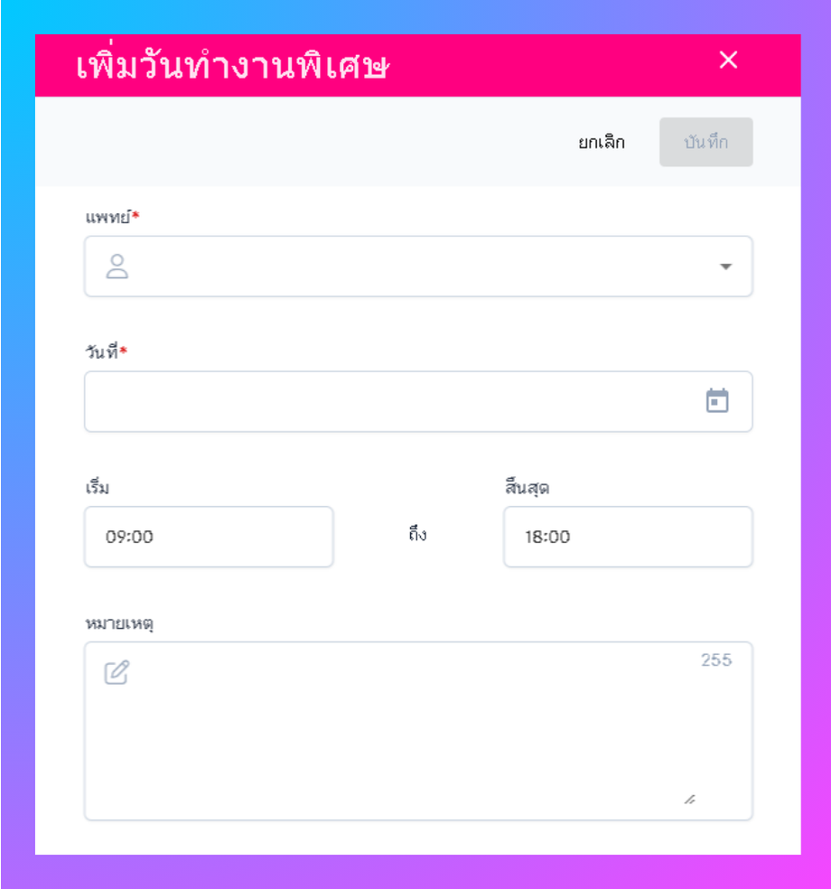 เมื่อผู้ใช้เข้าสู่หน้าเพิ่มวันทำงานพิเศษสามารถใส่ข้อมูลได้ดังนี้