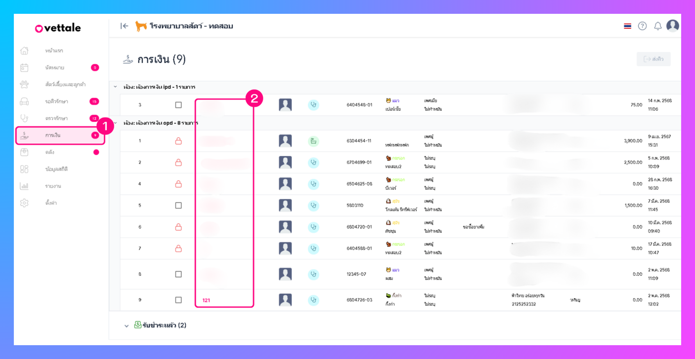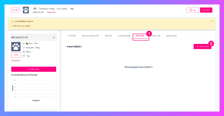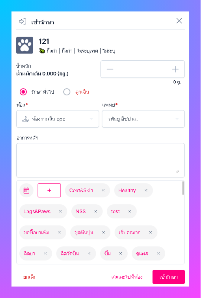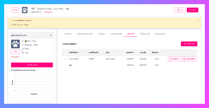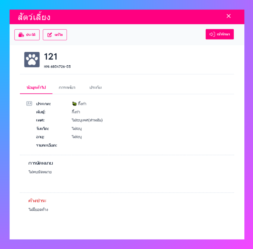 - ระบบจะแสดงรายละเอียดสัตว์เลี้ยง ให้คลิก เข้ารักษา