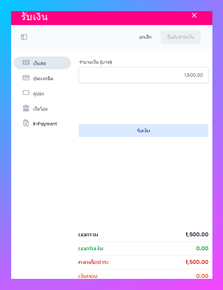- ระบบจะแสดงหน้าต่างเพื่อให้ผู้ใช้งานเลือกช่องทางการชำระเงิน และกรอกข้อมูลอื่นๆ เมื่อเสร็จแล้วคลิกปุ่มรับเงิน จากนั้นกด ยืนยันชำระเงิน