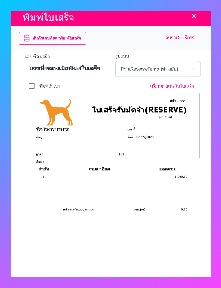 - ผู้ใช้งานสามารถเลือกบันทึกเลขที่และพิมพ์ใบเสร็จ หรือจบการรับบริการได้