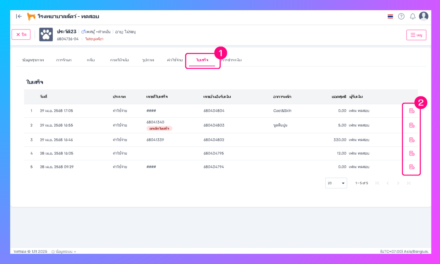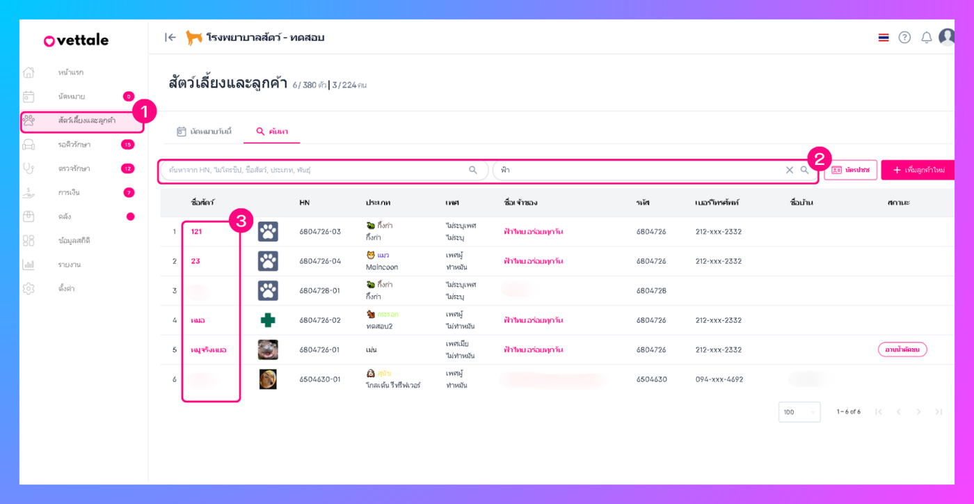 ไปที่เมนูสัตว์เลี้ยงและลูกค้า > ค้นหาชื่อสัตว์เลี้ยงหรือเจ้าของที่ต้องการยกเลิกใบเสร็จ > คลิกที่ชื่อสัตว์ที่ต้องการ