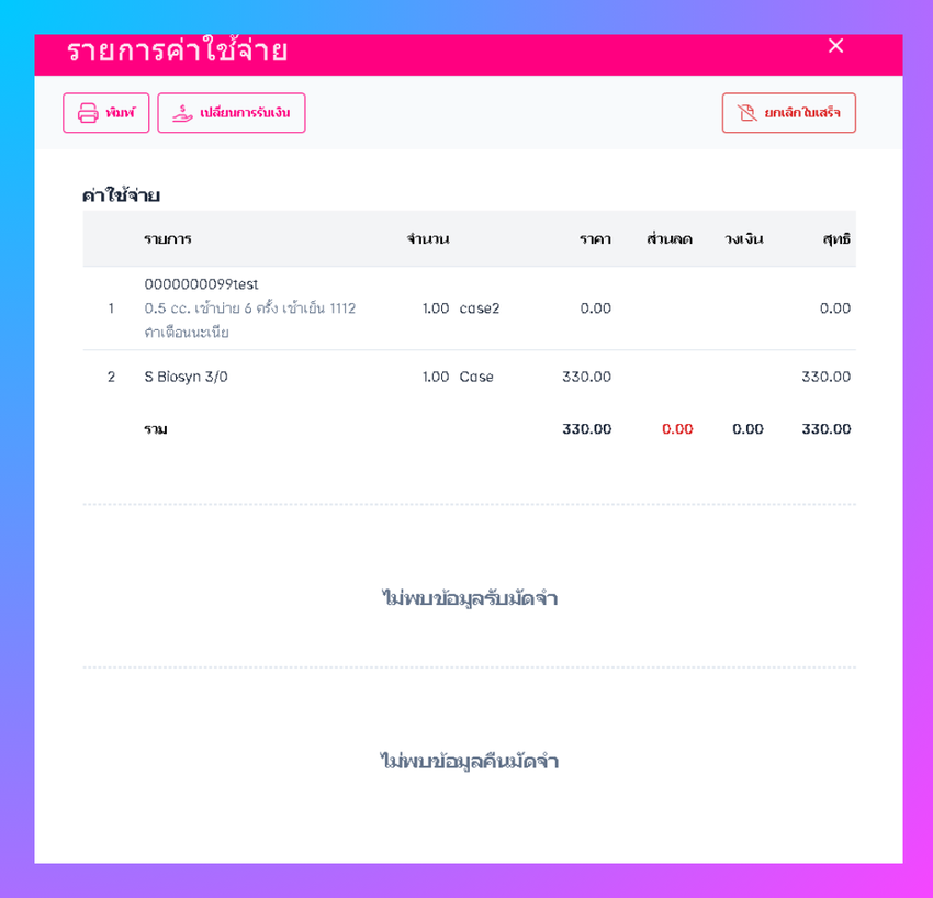 ระบบจะเข้าสู่หน้ารายละเอียดรายการค่าใช้จ่าย ให้ผู้ใช้คลิก ยกเลิกใบเสร็จ