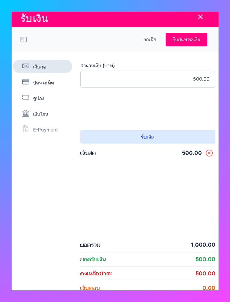 ผู้ใช้งานทำการระบุช่องทางการชำระเงิน เช่น เงินสด, บัตรเครดิต, หรือโอนเงิน