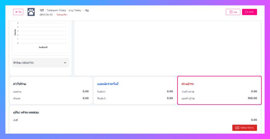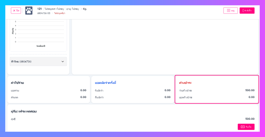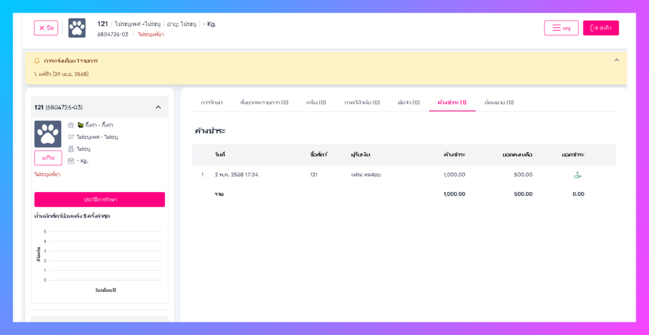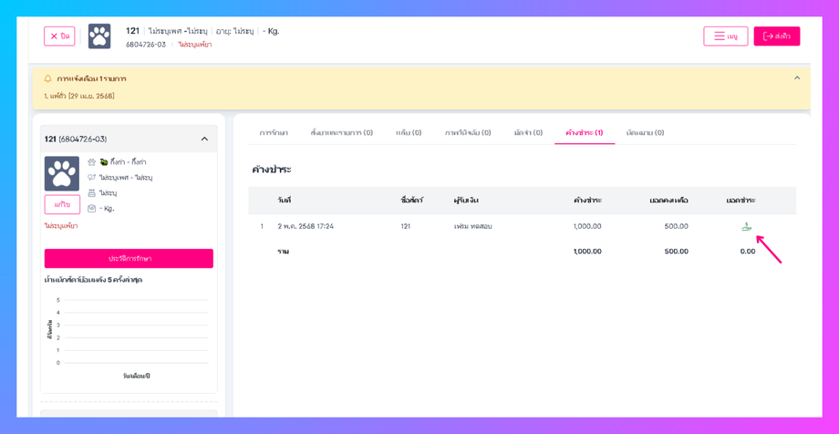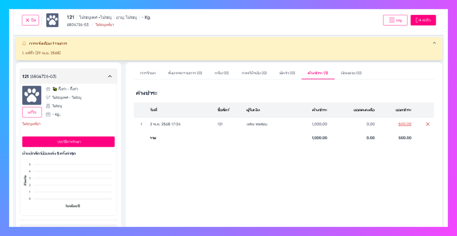 เมื่อรับเงินแล้วระบบจะปิดรายการจ่ายเงินและจะขึ้นรายการค้างชำระที่ประวัติสัตว์ป่วย