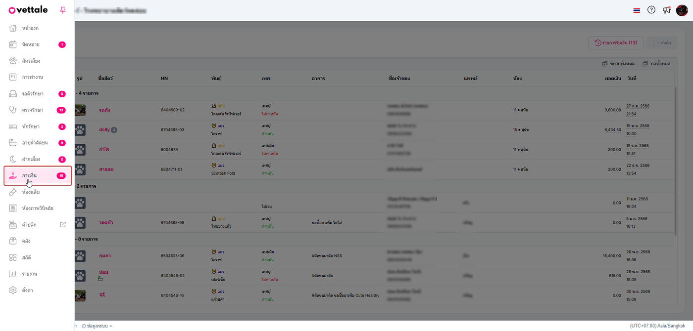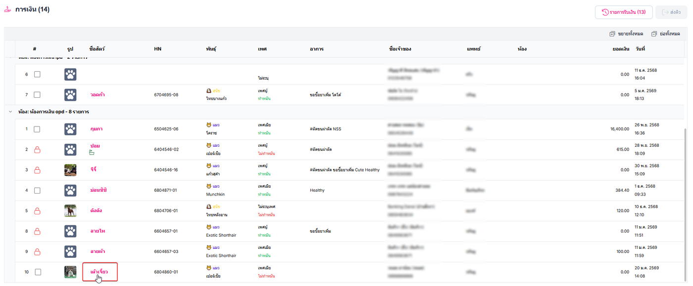 เลือกเมนูการเงิน ระบบจะแสดงสัตว์เลี้ยงที่อยู่ในคิวห้องการการเงิน