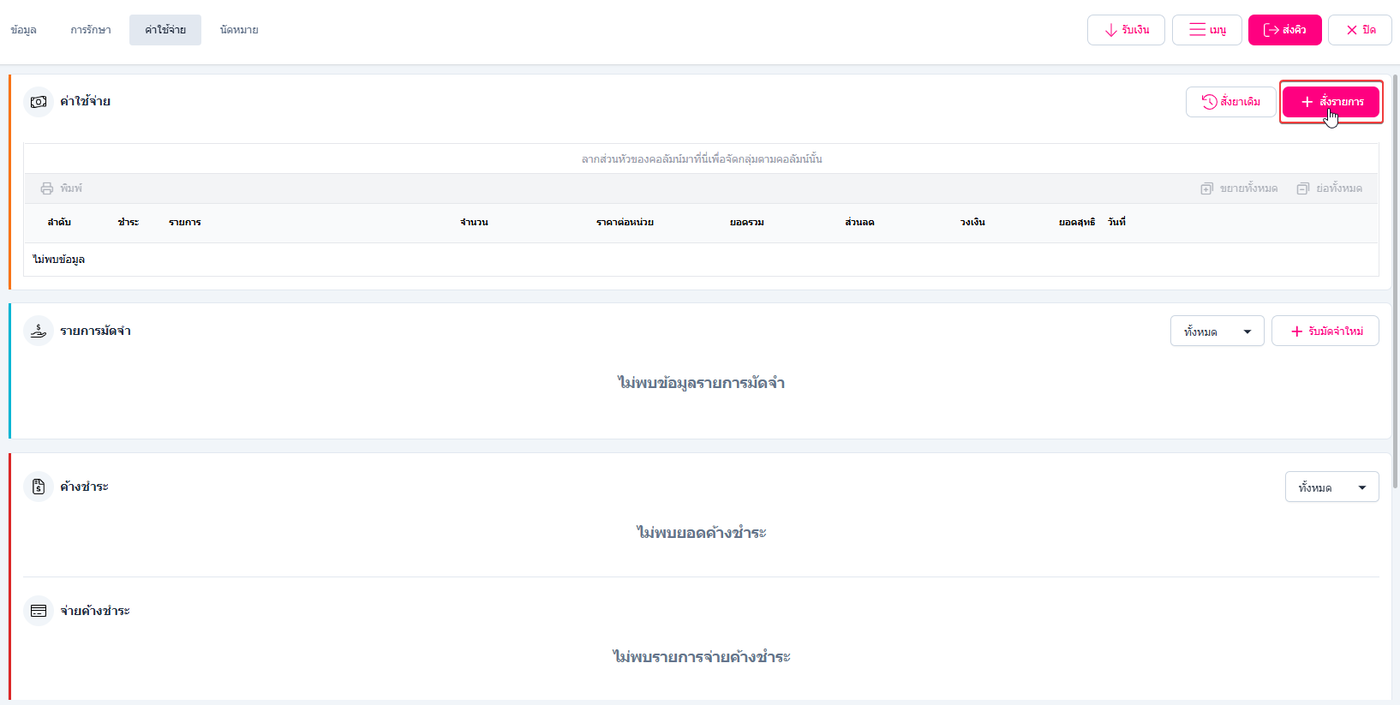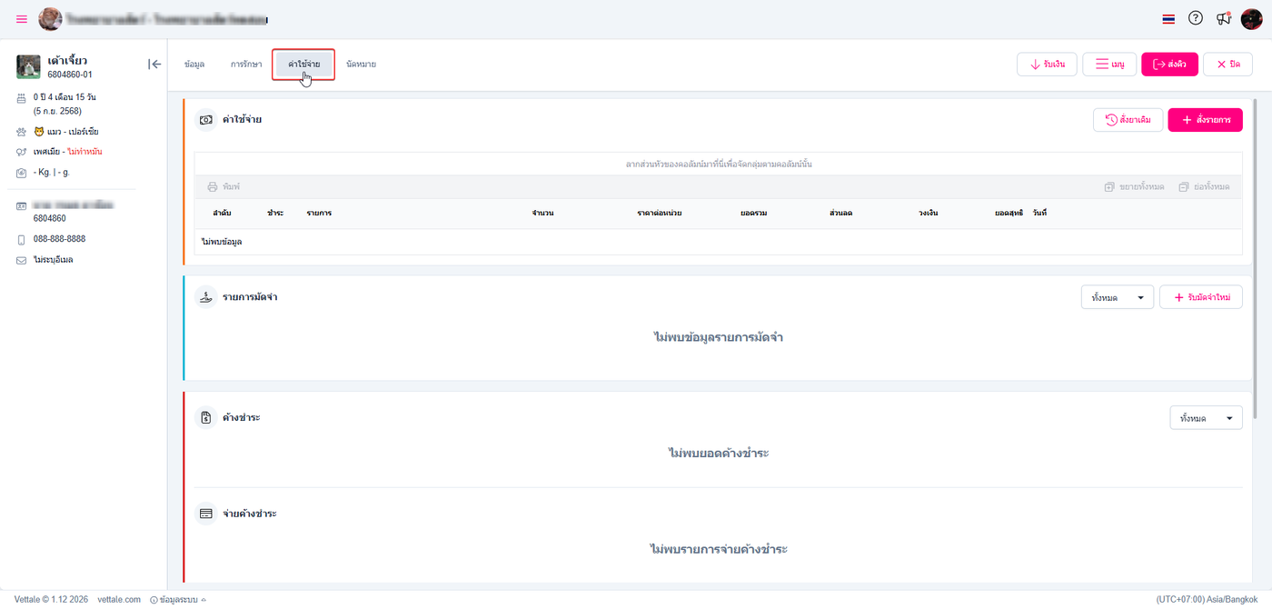 ผู้ใช้งานเลือกแถบ ค่าใช้จ่าย ระบบจะแสดงหัวข้อค่าใช้จ่ายต่างๆในแถบนี้