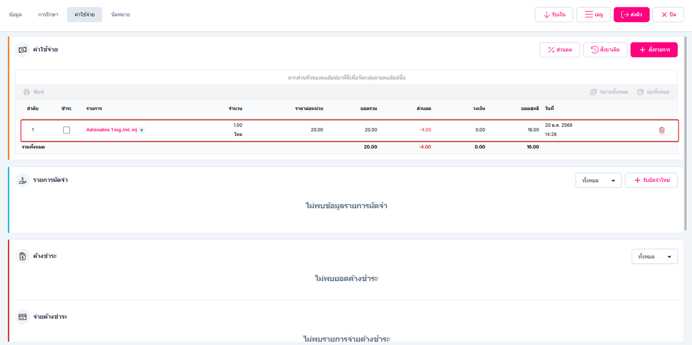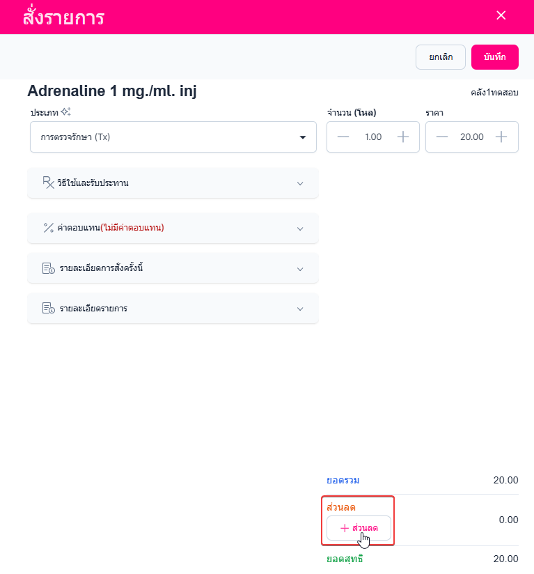 การเพิ่มส่วนลดแต่ละรายการ ใช้สำหรับกำหนดส่วนลดให้กับรายการสินค้าหรือบริการเป็นรายรายการตามเงื่อนไขที่คลินิกกำหนด ทั้งนี้ ผู้ใช้งานที่จะสามารถดำเนินการเพิ่มส่วนลดในแต่ละรายการได้ จะต้องได้รับสิทธิ์การใช้งานในการเพิ่มส่วนลดจากระบบก่อนเท่านั้น