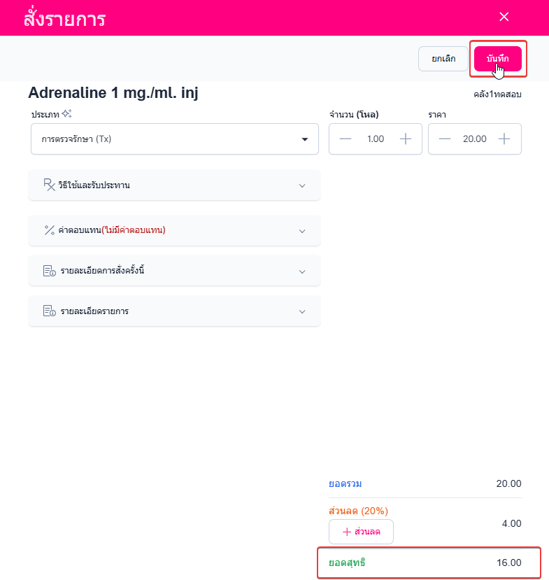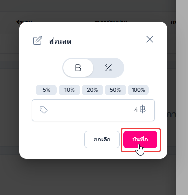 เมื่อใส่ส่วนลดเสร็จสิ้น ผู้ใช้งานคลิก บันทึก ระบบจะบันทึกส่วนลดของรายการนั้น