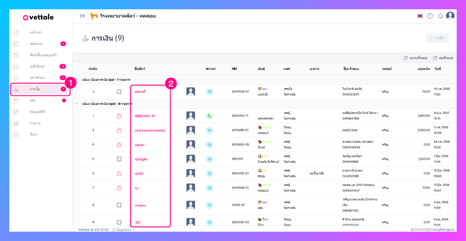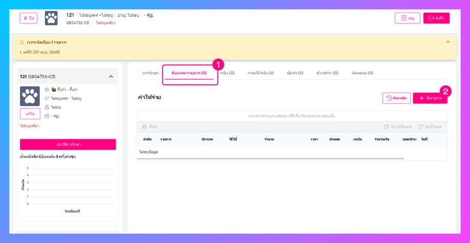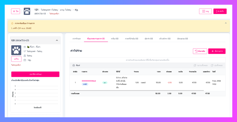 เลือกเมนูการเงิน > คลิกชื่อสัตว์เลี้ยงที่ต้องการใช้ส่วนลด