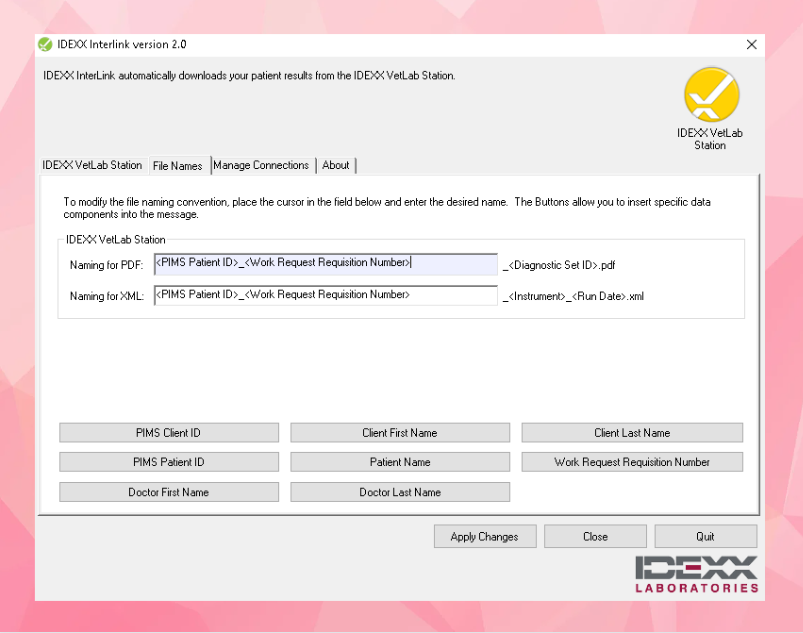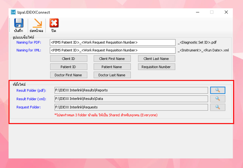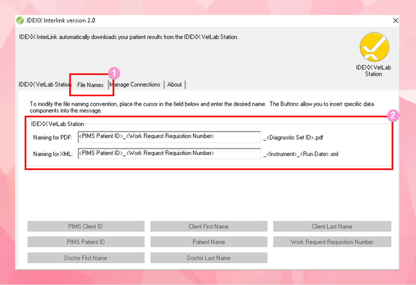 โดยการไปที่หน้า File Name ในโปรแกรม IDEXX Interlink และกรอกรูปแบบไฟล์ให้เหมือนกับโปรแกรมIDEXX Interlink