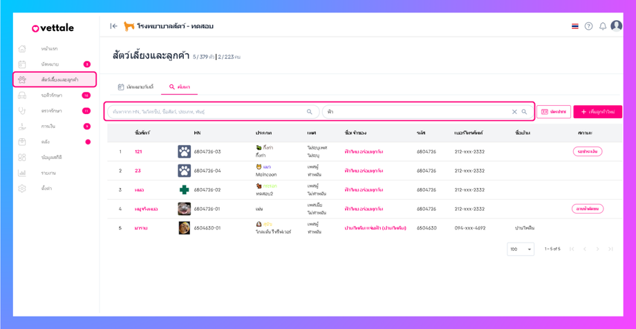 1. เลือกค้นหาโดยรหัส ชื่อสัตว์ หรือเจ้าของ และคลิกค้นหา