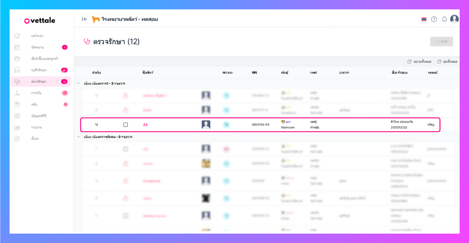 • ระบบจะเข้าสู่หน้า ห้องตรวจ โดยแสดงชื่อสัตส์ที่ผู้ใช้งานส่งคิวมาในห้องตรวจ (ระบบจะแสดงรายการการใช้บริการโดยแยกการรักษา การรับบริการ )