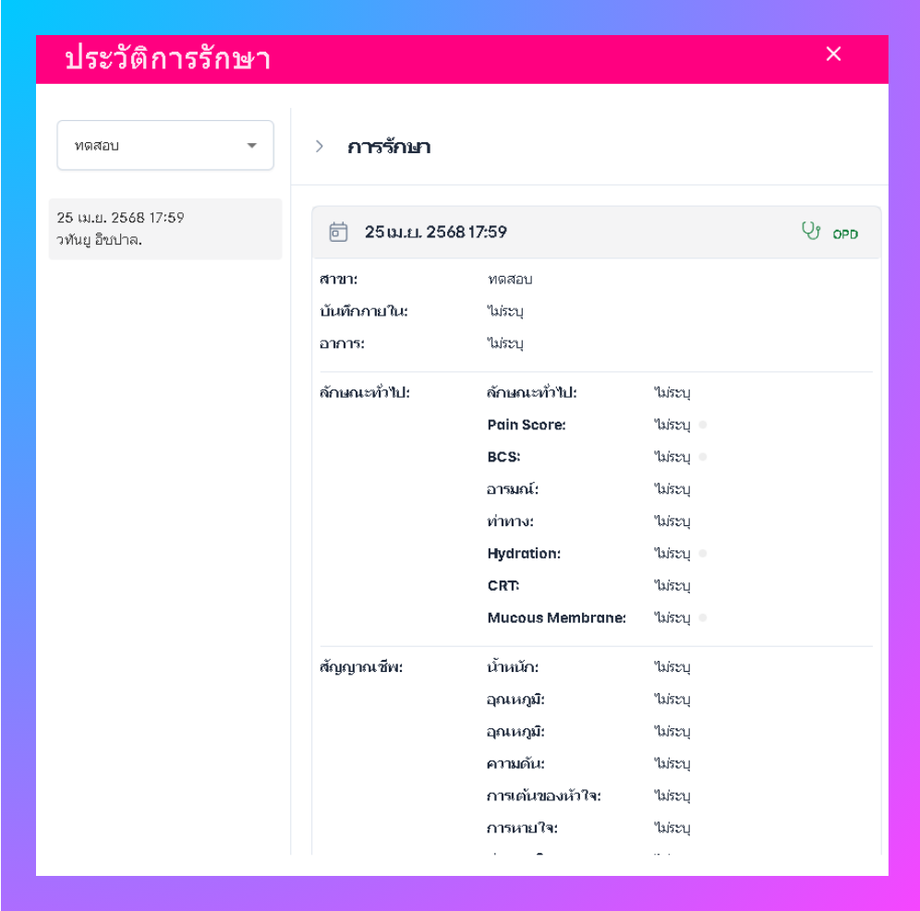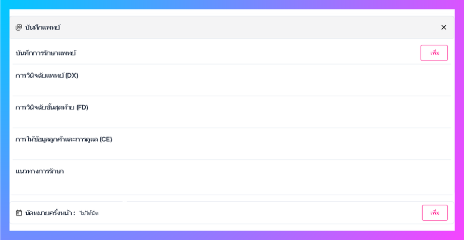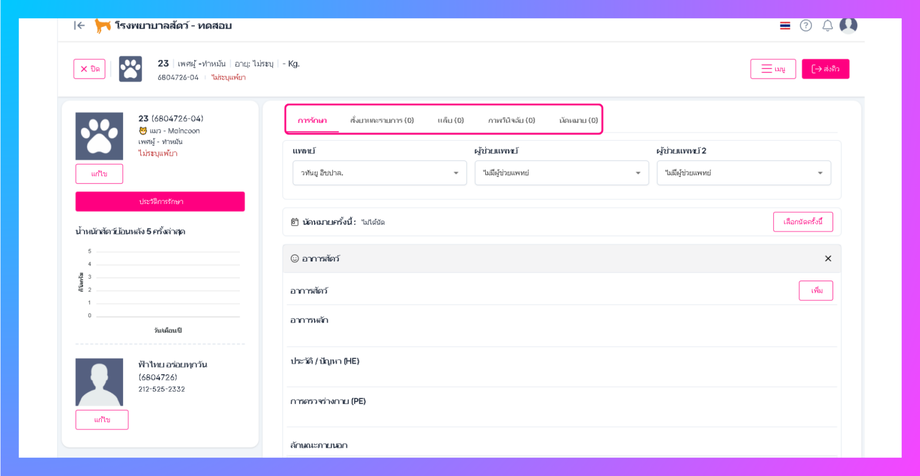 • ผู้ใช้สามารถเพิ่มข้อมูลการตรวจและอาการสัตว์ได้