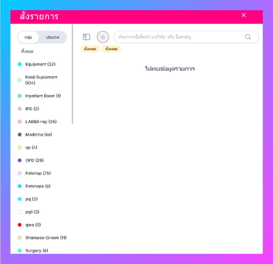 ระรบบจะเข้าสู่หน้าสั่งรายการผู้ใช้สามารถสั่งรายการได้โดย การค้นหาโดยชื่อ หรือหาจาากประเภทและกลุ่มที่อยู่ทางซ้าย