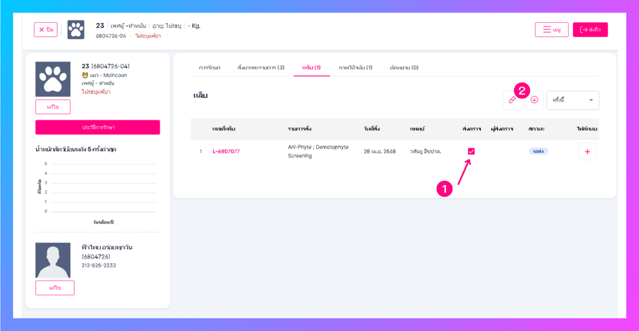 • ติ้กที่หน้าชื่อสัตว์ที่ต้องการส่งและ กดส่งคิว