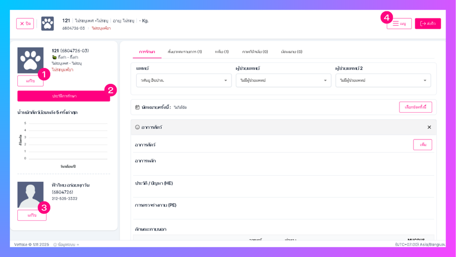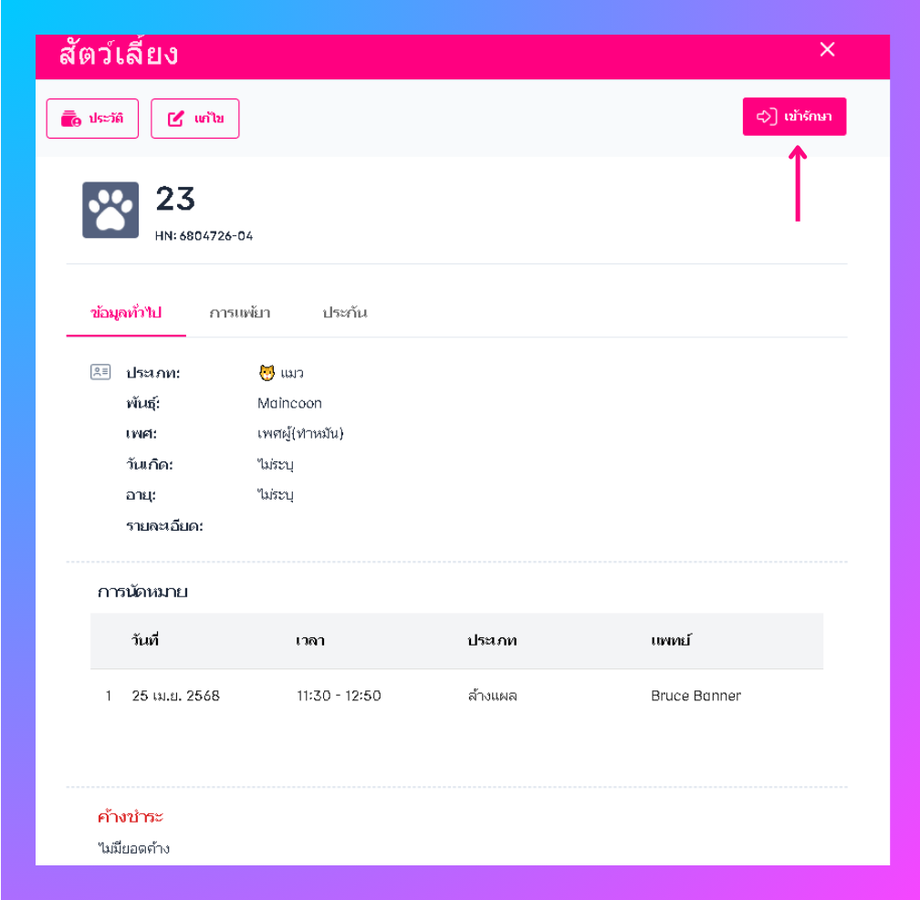 • ระบบจะเข้าสู่หน้ารายละเอียดข้อมูลสัตว์เลี้ยง ให้ผู้ใช้กด เข้ารักษา เพื่อทำการกรอกข้อมูลของสัตว์เลี้ยง