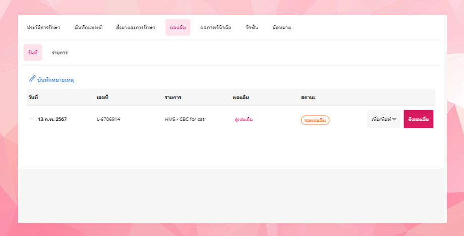 • ระบบจะแสดงรายการผลแล็บ ให้ผู้ใช้งานคลิก ดึงผลแล็บ