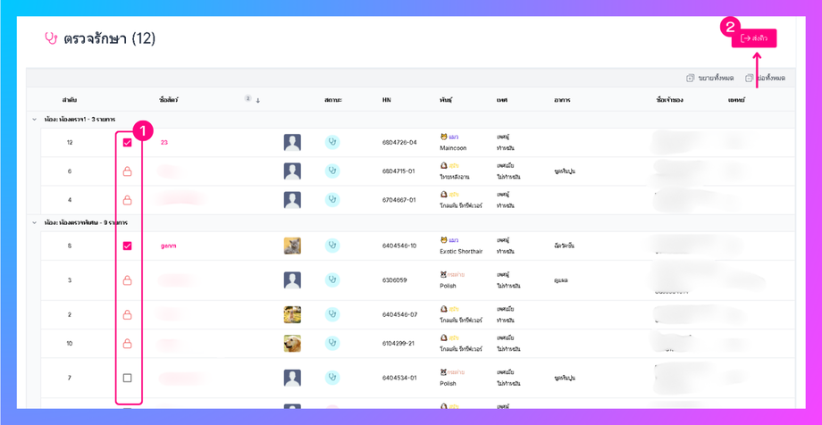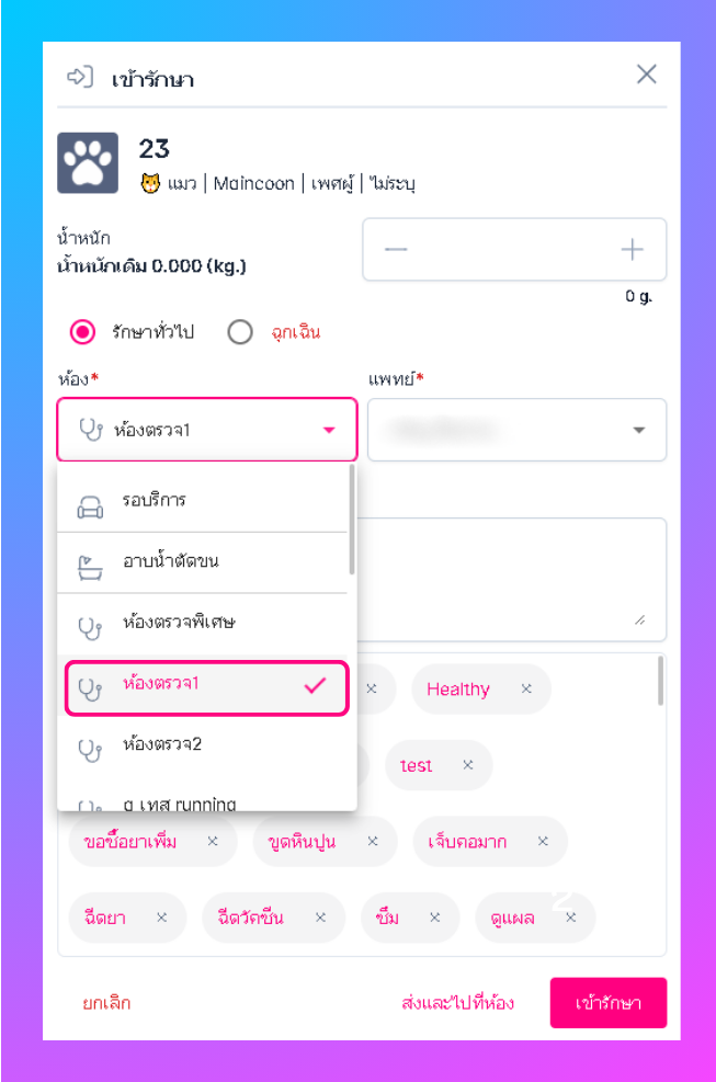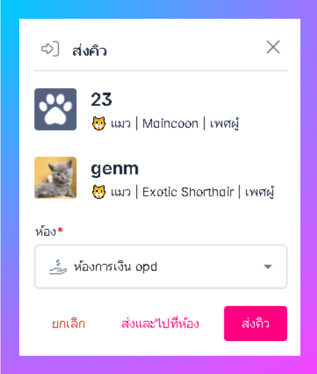 ผู้ใช้งานสามารถเลือกส่งสัตว์เลี้ยงได้ จากนั้น กด ส่งและไปที่ห้องหรือส่งคิว
