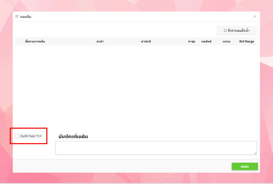 • ระบบจะแสดงหน้าต่างผลแล็บ ผู้ใช้งานสามารถเลือกบันทึกเป็นไฟล์PDFได้