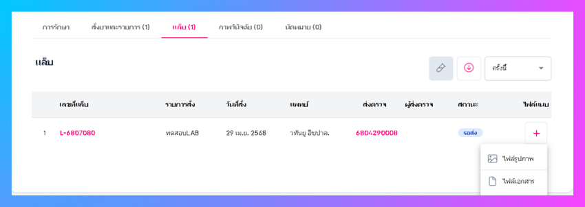 คลิกรูปเครื่องหมายบวกที่รายการผลแล็บ > ผู้ใช้งานสามารถ เพิ่มรูปภาพ เพิ่มเอกสาร และพิมพ์ผลแล็บ