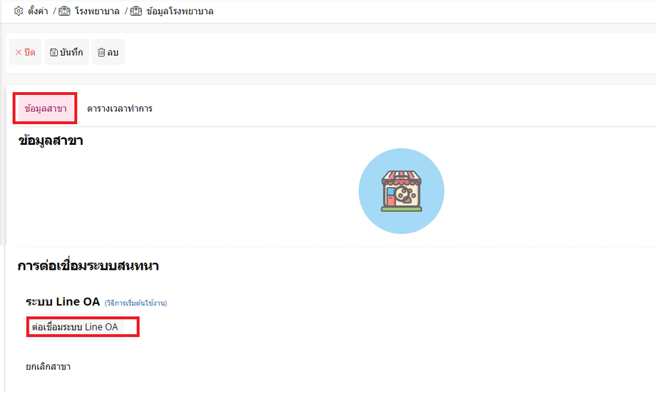 ผู้ใช้งานจะเข้าสู่หน้าข้อมูลสาขาจากนั้นเลื่อนลงล่างสุดจะเจอหัวข้อ ต่อเชื่อมระบบสนทนา Line OA คลิกที่ต่อเชื่อมระบบ Line OA