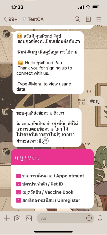 เมื่อคนไข้ทำการ เพิ่มเพื่อนกับระบบ Line OA แล้วให้คนไข้พิมพ์ #เมนู ระบบLine OA จะส่งข้อความอัตโนมัติให้คนไข้ลงทะเบียน