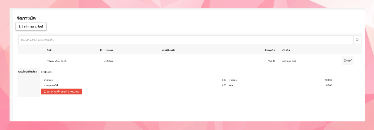 - ระบบจะแสดงรายการบิลที่ผู้ใช้งานค้นหา สามารถคลิกที่บิล เพื่อแสดงเลขอ้างอิงรับเงิน และรายการสินค้าได้ (สามารถสั่งพิมพ์ได้)