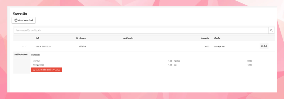 • ระบบจะแสดงรายการบิลที่ผู้ใช้งานค้นหา สามารถคลิกที่บิล เพื่อแสดงเลขอ้างอิงรับเงิน และรายการสินค้าได้ (สามารถสั่งพิมพ์ได้)