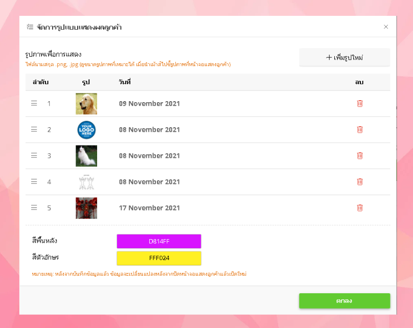 • ระบบจะแสดงหน้าต่างจัดการรูปแบบแสดงผลลูกค้า ผู้ใช้งานสามารถเพิ่มหรือลบรูป สีพื้นหลังและสีตัวอักษรได้ เมื่อเสร็จแล้ว คลิกตกลง