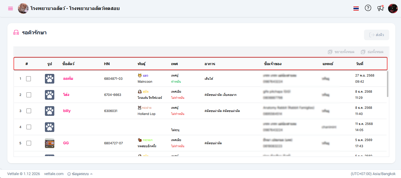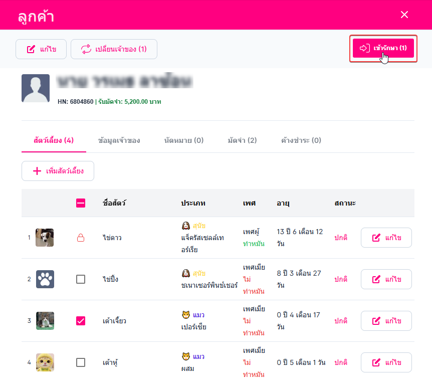 ระบบจะแสดงหน้าต่างสัตว์เลี้ยงทั้งหมดของเจ้าของ ให้ผู้ใช้งานติ๊กถูกหน้าสัตว์เลี้ยงที่ต้องการส่งไปในห้องรอคิวรักษาและคลิก เข้ารักษา