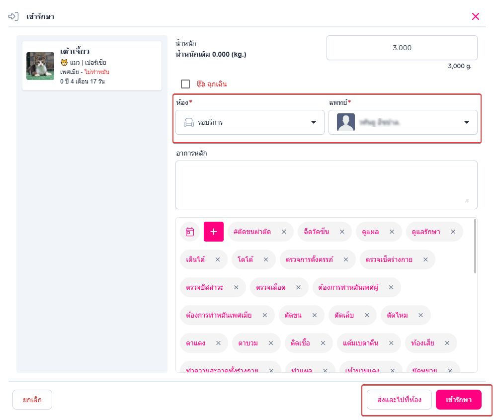 เข้ารักษา : สัตว์เลี้ยงจะถูกส่งไปยังห้องที่ผู้ใช้งานเลือก