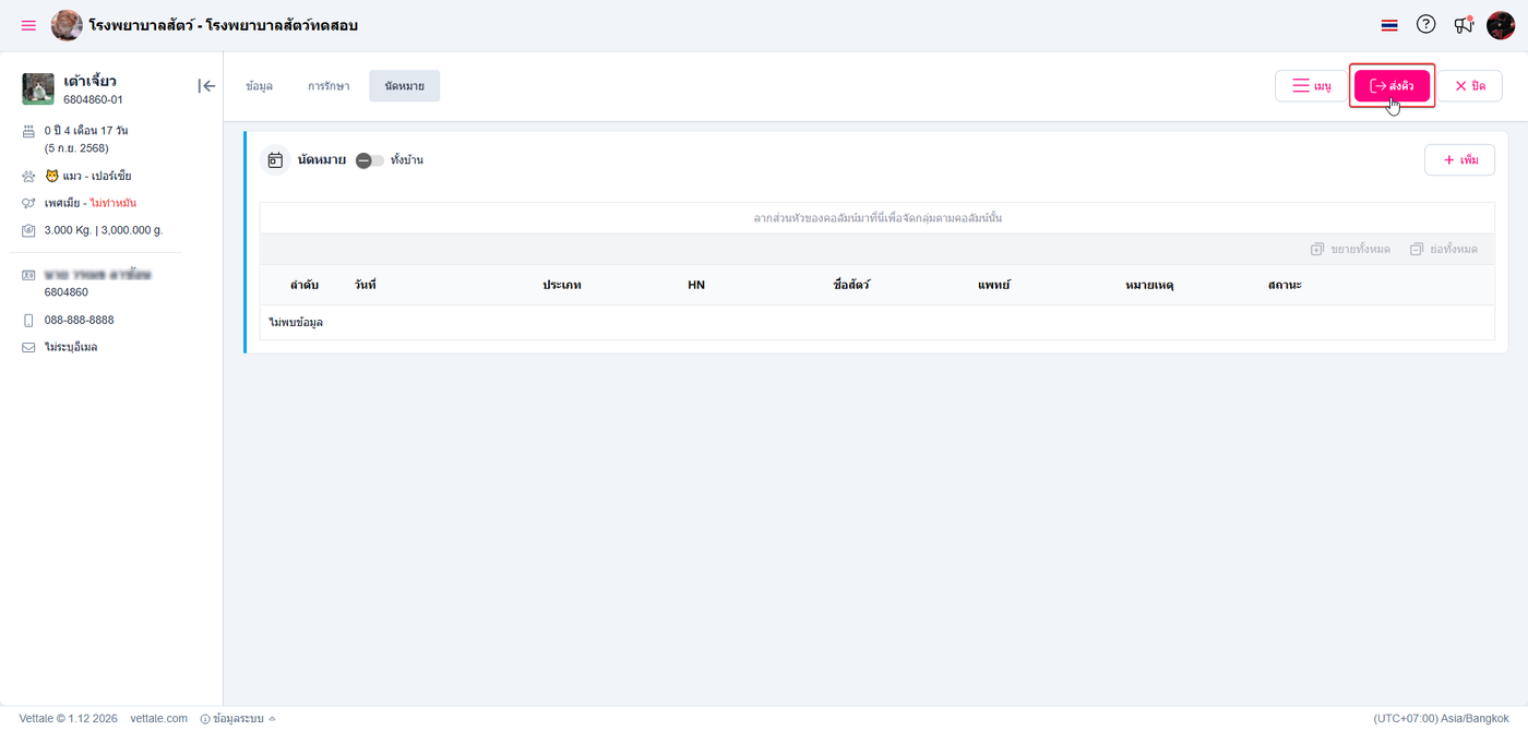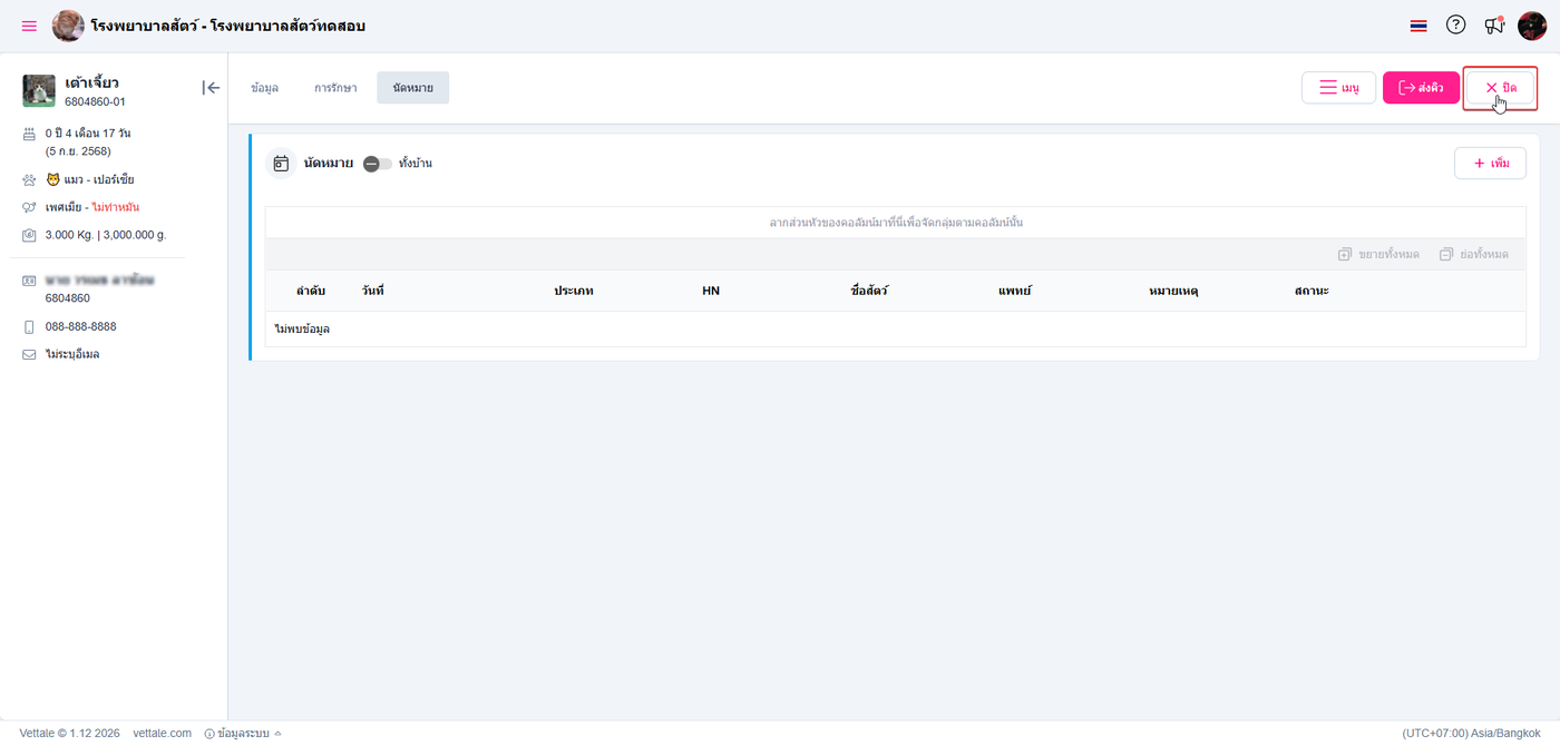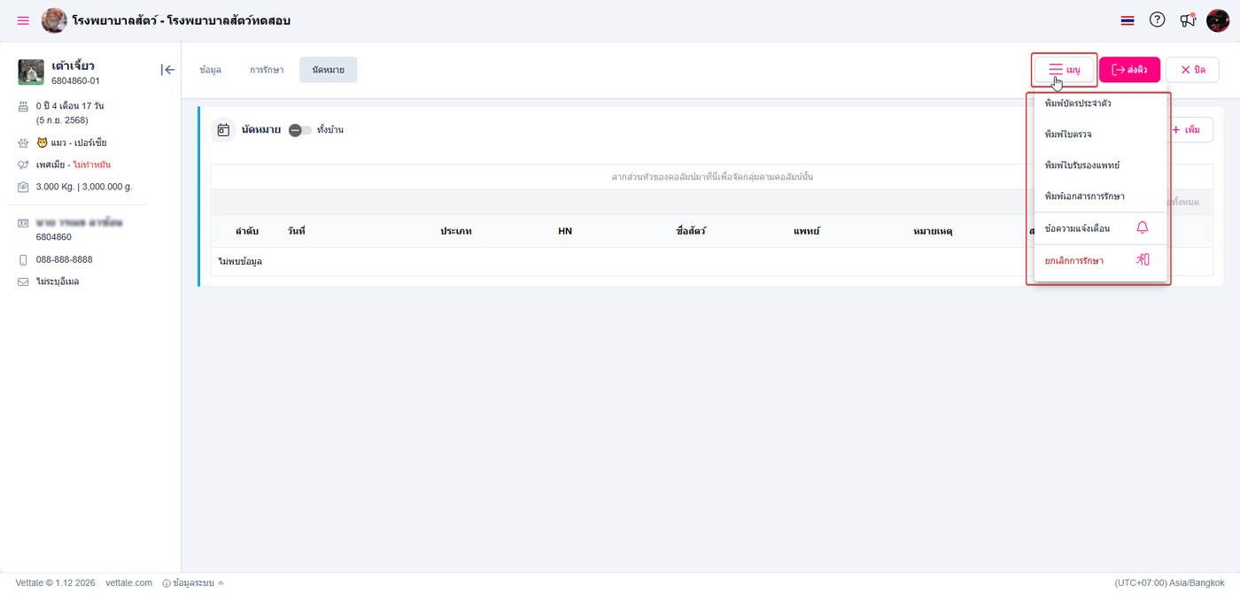 ยกเลิกการรักษา : ผู้ใช้งานสามารถยกเลิกการรักษาได้ โดยสัตว์เลี้ยงต้องไม่มีรายการที่ค้างจึงสามารถยกเลิกการรักษาได้