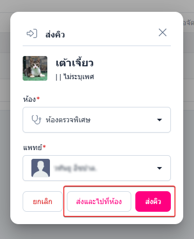 ผู้ใช้งานเลือกห้องรอบริการที่ต้องการส่งคิวสัตว์เลี้ยงและเลือกแพทย์ที่ดูแลสัตว์เลี้ยง