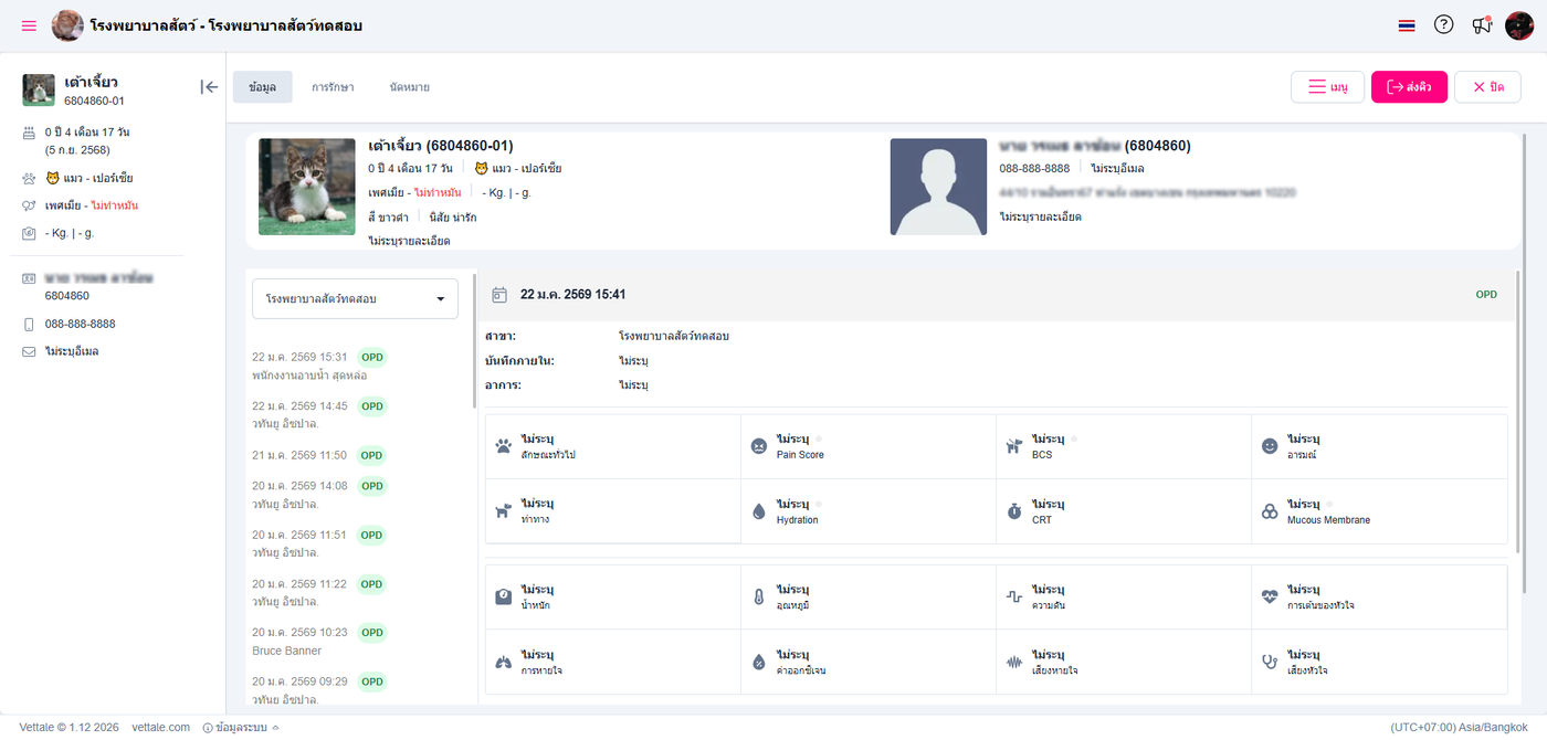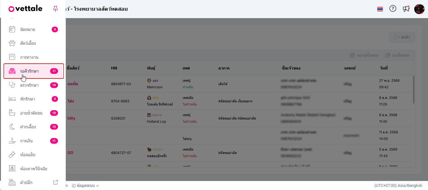 เมื่อผู้ใช้งานค้นหาสัตว์เลี้ยงที่ต้องการส่งไปในห้องรอคิวรักษาเสร็จสิ้น คลิกที่ชื่อสัตว์เลี้ยง