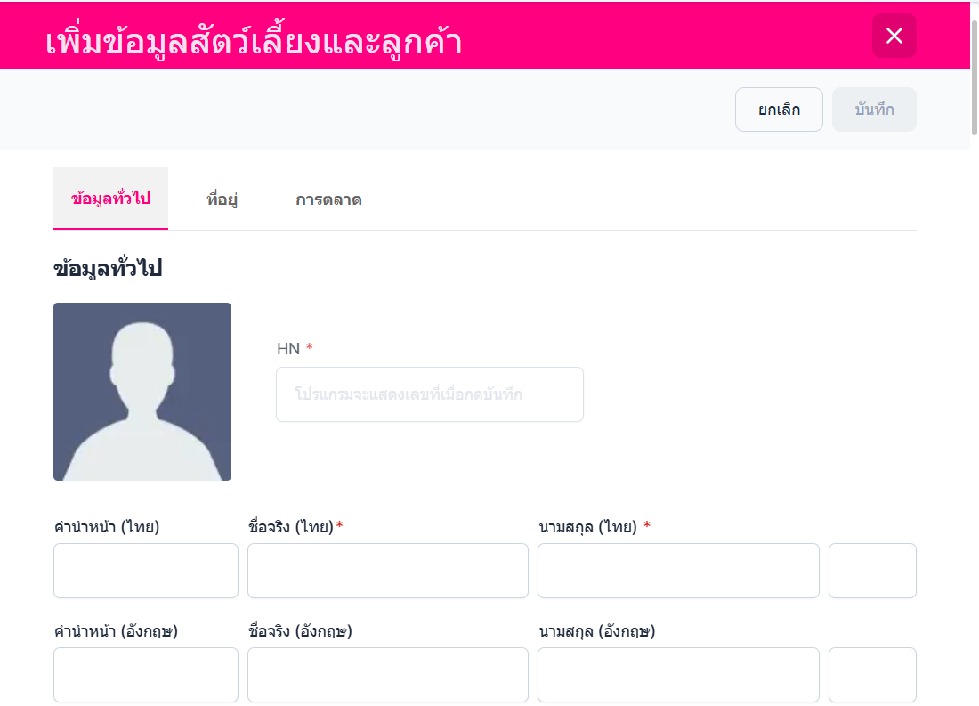 เมื่อคลิก +เพิ่มลูกค้าใหม่ ระบบจะแสดงหน้าต่างเพิ่มข้อมูลสัตว์เลี้ยงและลูกค้า