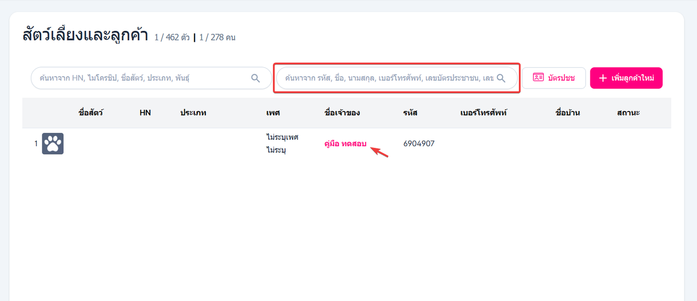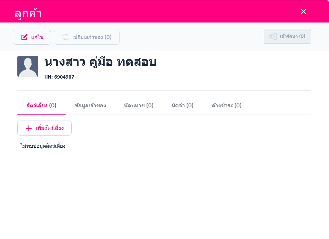 ระบบจะเข้าสู่หน้ารายละเอียดข้อมูลเจ้าของสัตว์ ใช้ผู้ใช้งานคลิก +เพิ่มสัตว์เลี้ยง