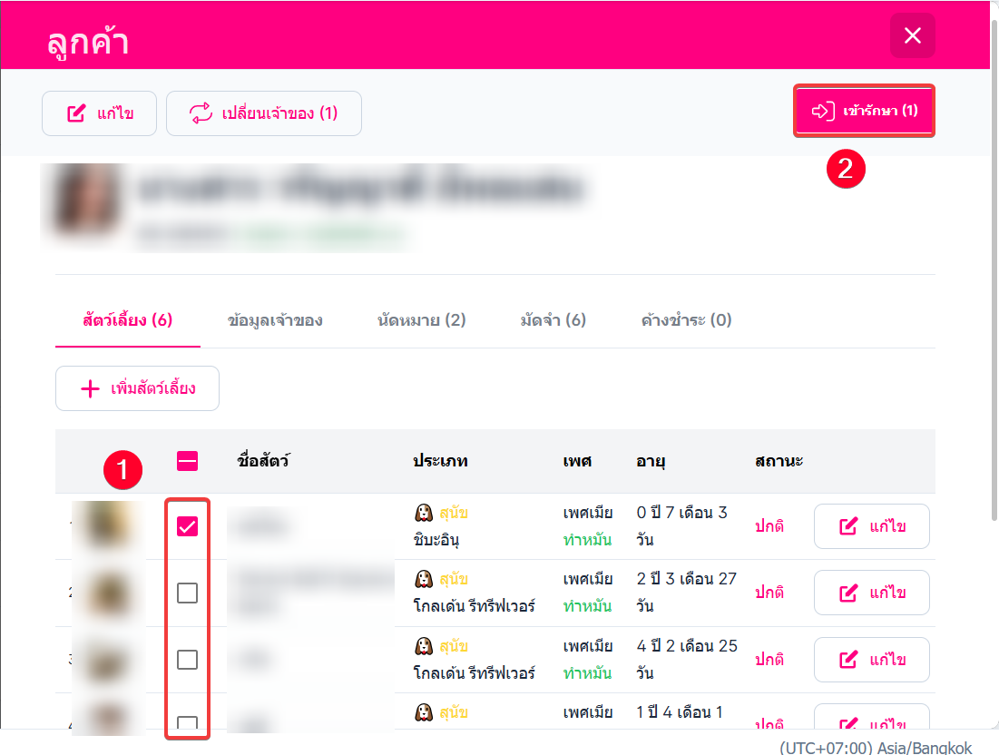 หน้ารายละเอียดลูกค้า ให้ติ้กช่องหน้าชื่อสัตว์ที่ต้องการส่งพร้อมกัน