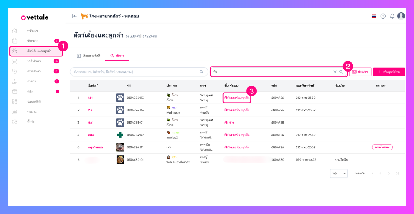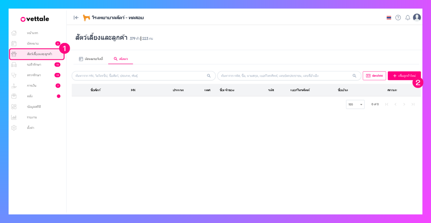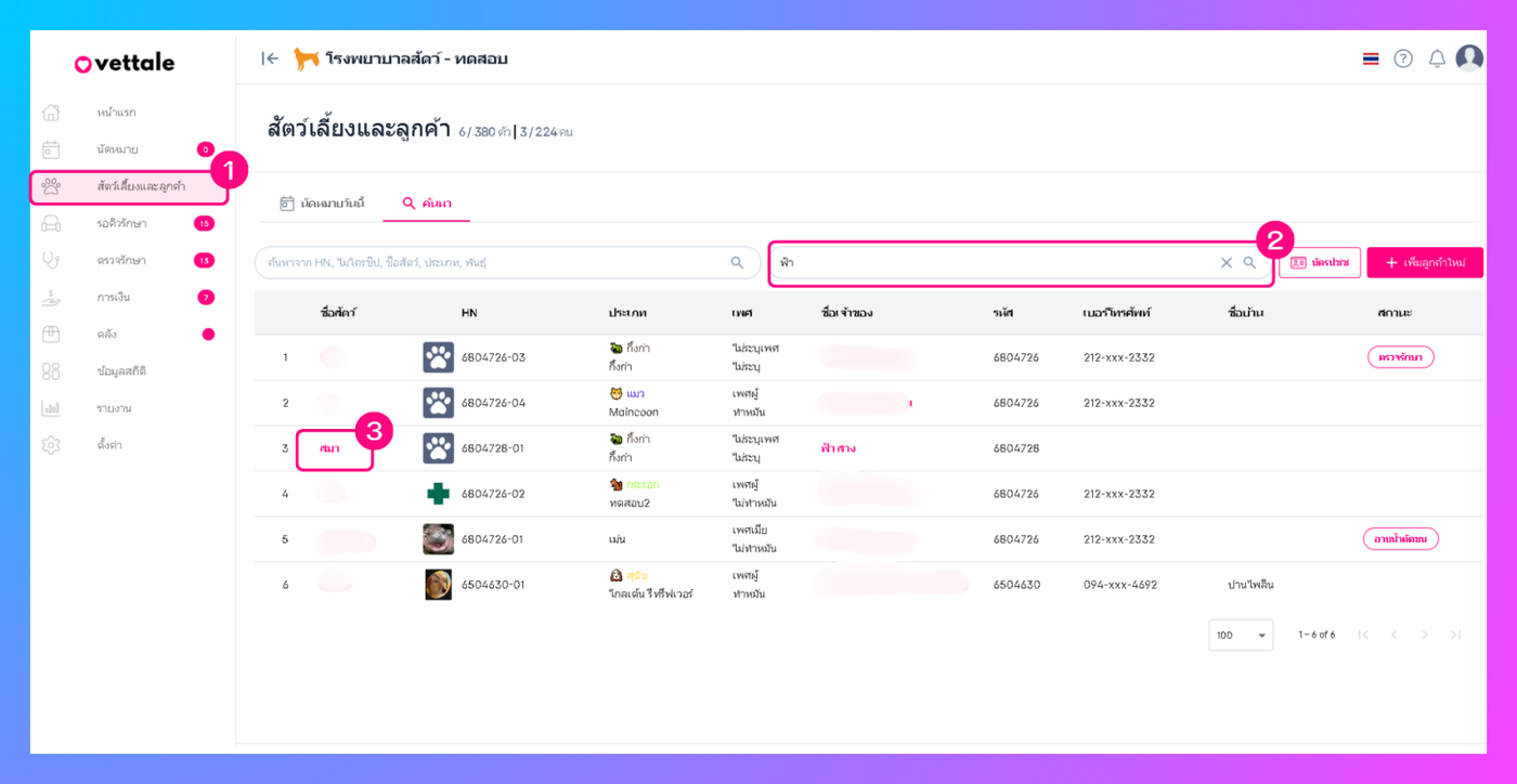 - ทำได้โดยการไปที่เมนูสัตว์เลี้ยงและลูกค้า เลือกค้นหา