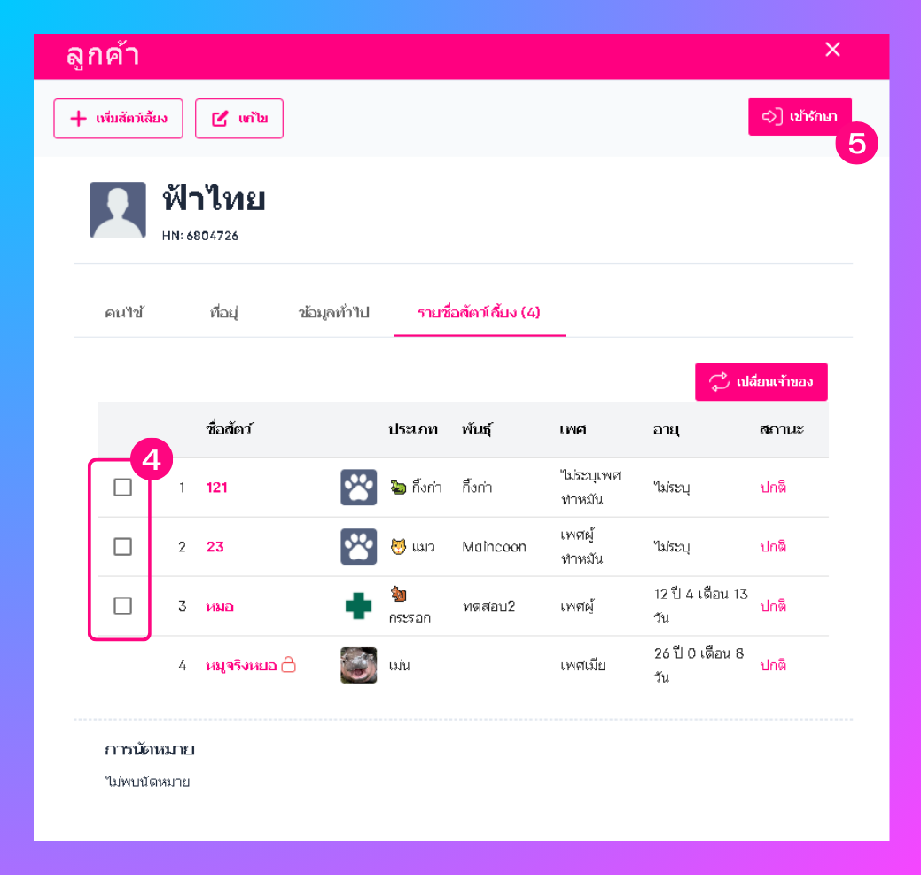 - เลือกเมนูสัตว์เลี้ยงและลูกค้า