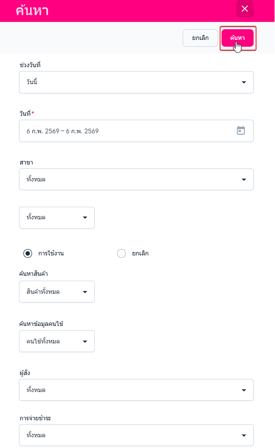 • ช่วงวันที่ ผู้ใช้งานเลือกช่วงวันที่ หรือ กำหนดวันที่เอง : ระบบจะทำการค้นหาในช่วงวันที่ที่ผู้ใช้งานระบุ