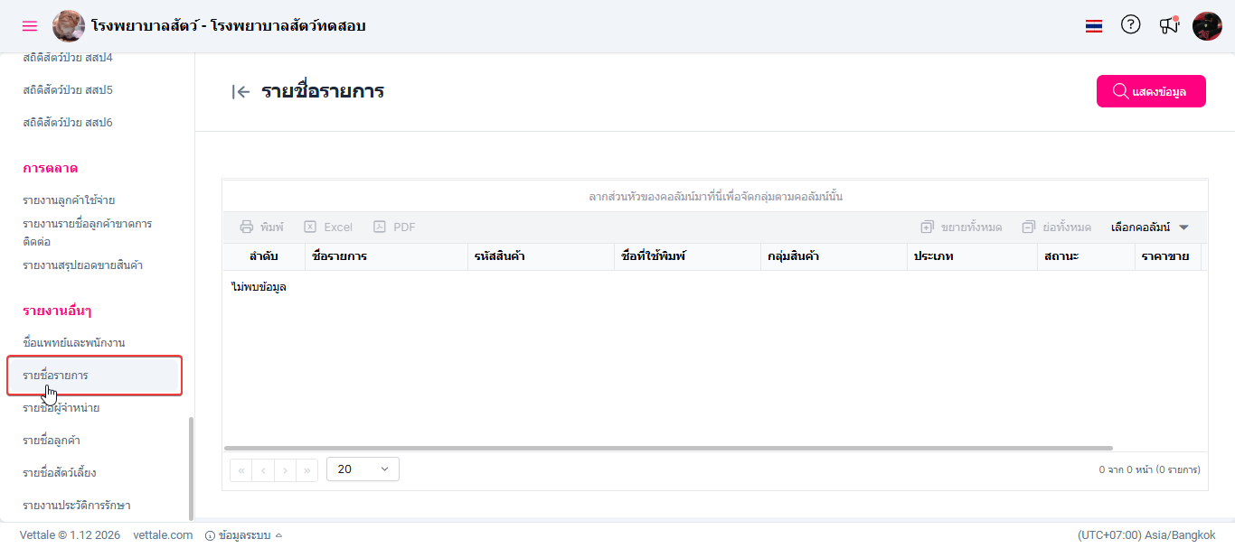 ผู้ใช้งานเลือกหัวข้อรายชื่อรายการ ระบบจะแสดงหน้าต่างรายงานรายชื่อรายการ